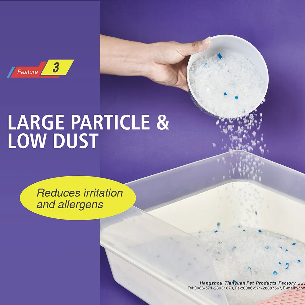 5. Fácil de recoger y limpiar Nuestra arena para mascotas de cristal de sílice está diseñada para recogerla y limpiarla fácilmente, por lo que el mantenimiento de la caja de arena es muy sencillo. Las partículas grandes son fáciles de tamizar, lo que permite eliminar los residuos de forma rápida y eficaz. Con esta arena de cristal, mantener limpia la caja de arena es una tarea sencilla.