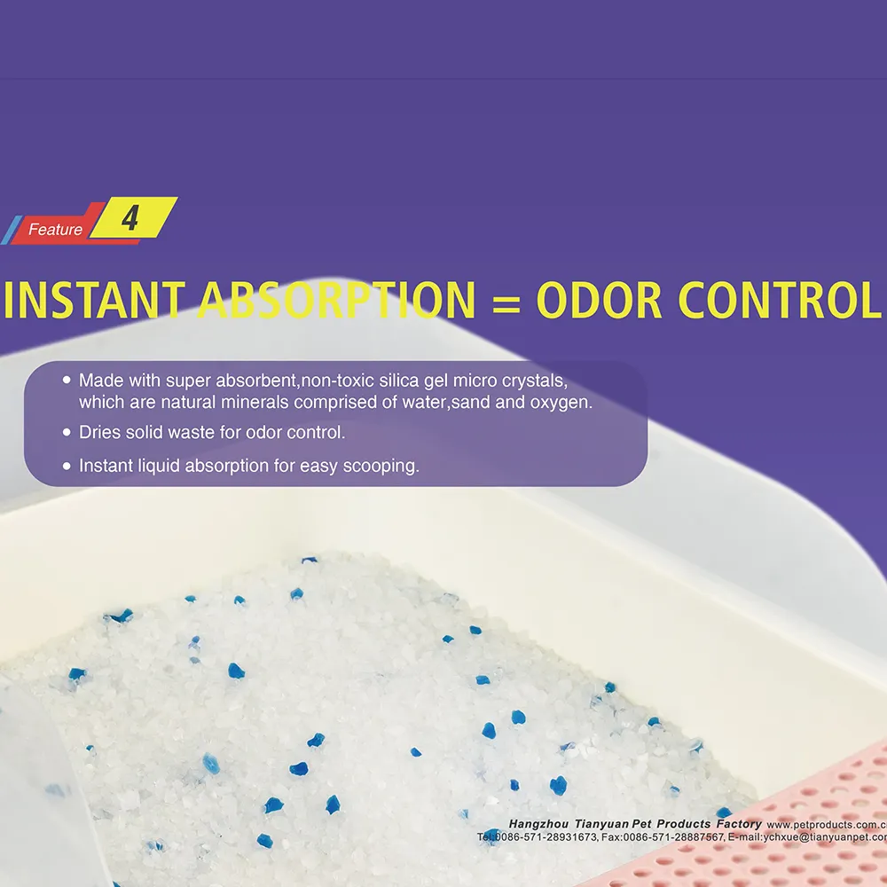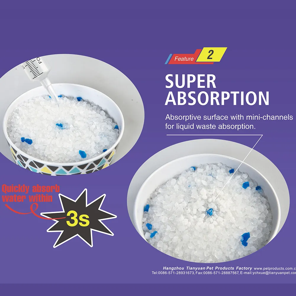 2. Absorción superior para sequedad Esta arena para gatos de cristal de sílice tiene una gran capacidad de absorción, absorbiendo rápidamente la humedad para mantener seca la caja de arena. Su alto índice de absorción garantiza que la arena permanezca seca, reduciendo la necesidad de limpieza frecuente. Con esta arena de sílice para gatos, puede prolongar el tiempo entre cambios de la caja de arena.