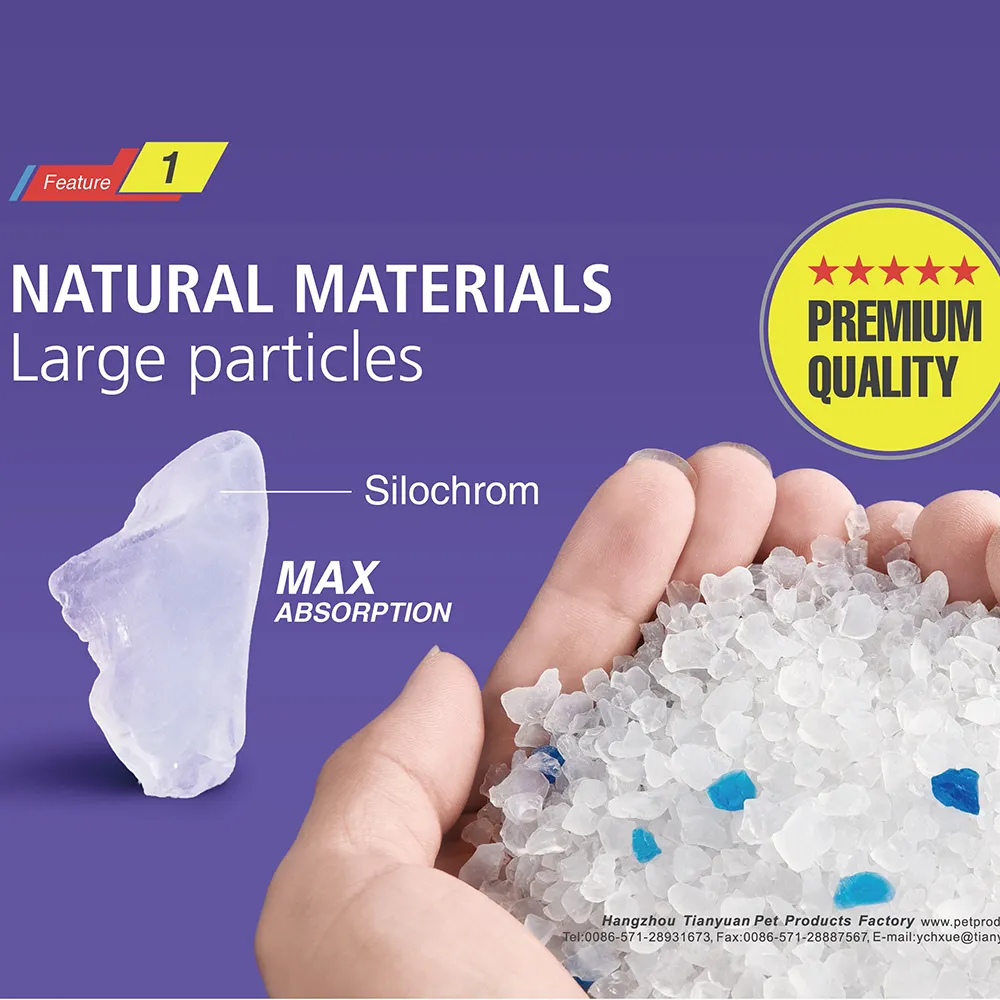 1. Hecho de sílice natural Nuestra arena cristalina para gatos está fabricada con sílice natural, ofreciendo una opción segura y no tóxica para su gato. Con esta arena absorbente para gatos, puede confiar en la calidad de los materiales utilizados.