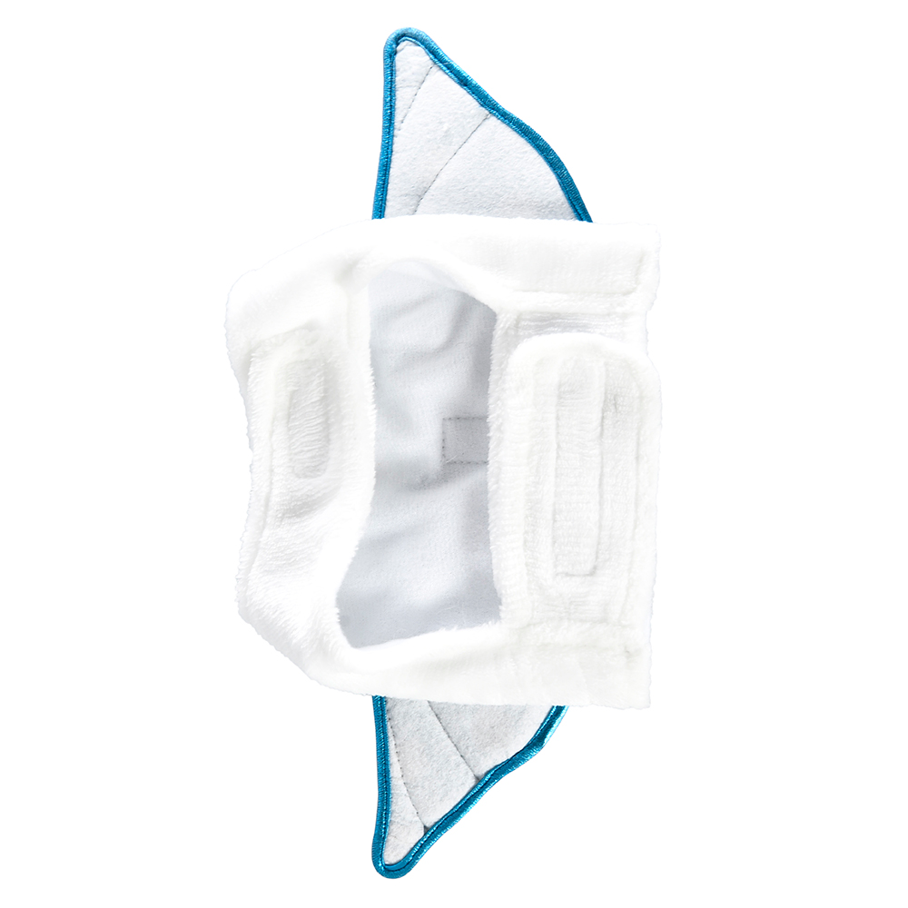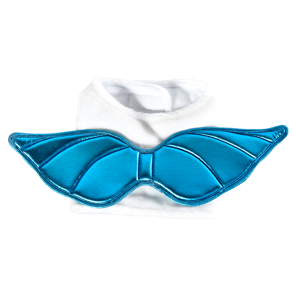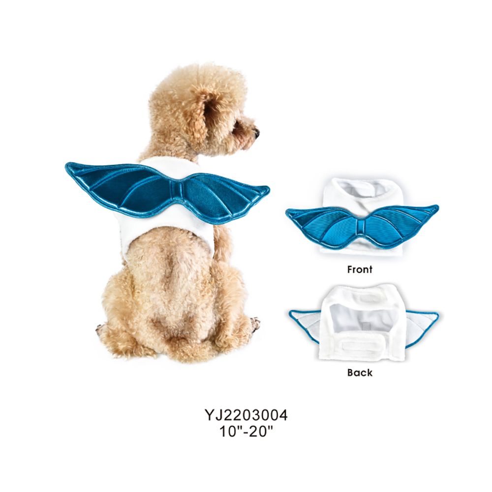 1. Celebra con estilo: Ropa novedosa para perros, adornada con encantadores detalles en forma de alas azules sobre una base de tela blanca.