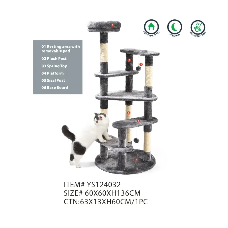 5.Sisal Post: Addressing cats’ natural scratching instincts is essential, and our cat tree features a sisal post for this purpose. It’s a durable material that encourages healthy scratching behavior, ensuring cats’ claws stay in optimal condition.
