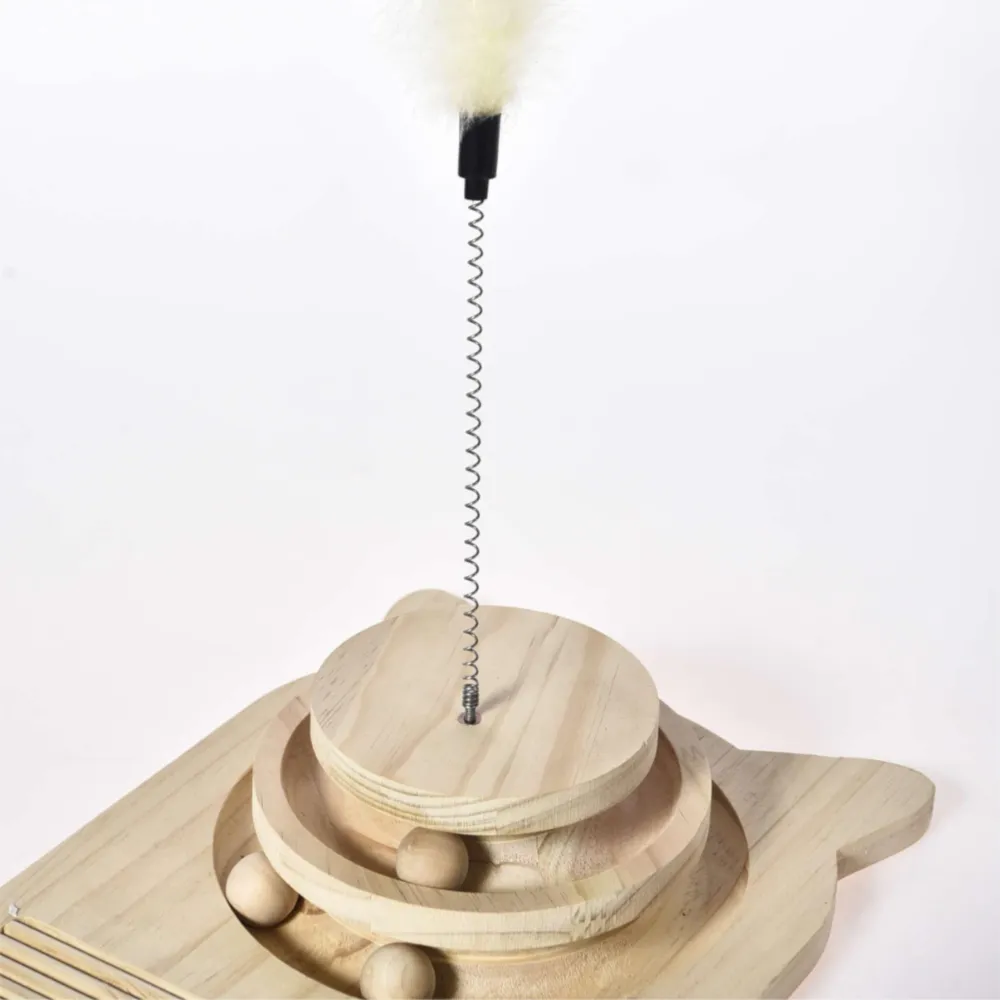 The cat scratcher wood two tiers ball track cat shape iq plate combines a durable scratching surface, interactive ball track, and built-in feather toy, providing cats with an engaging, fun, and mentally stimulating play experience.