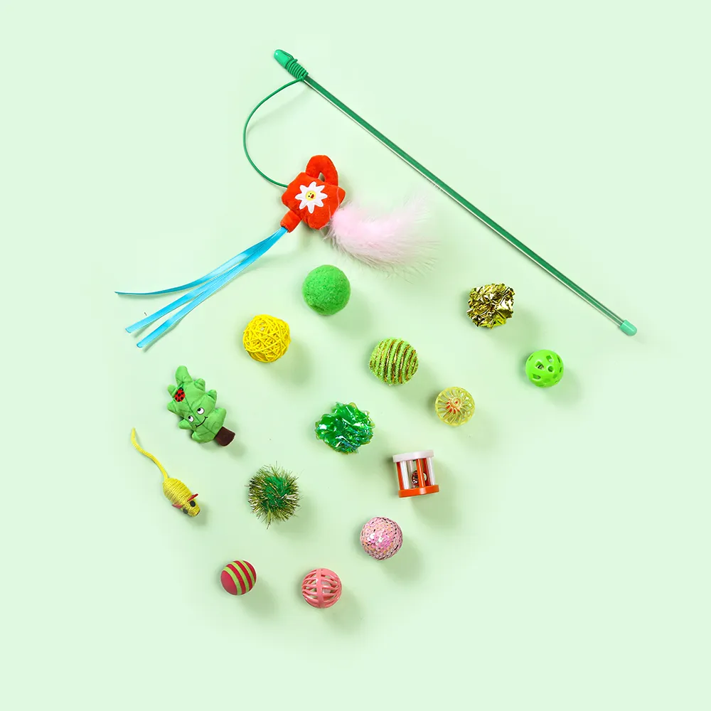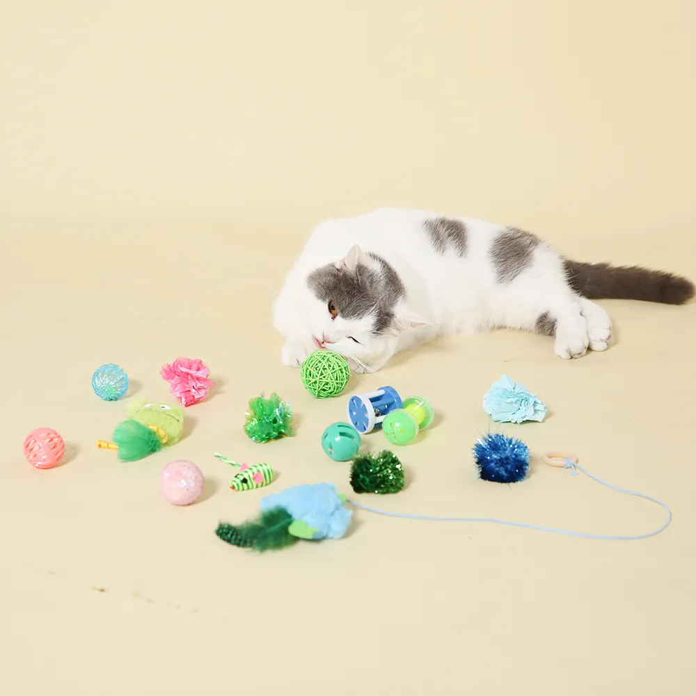 Coleção completa de brinquedos com 15 peças: Com 15 brinquedos diferentes num conjunto, o seu gato tem uma mistura de opções de jogo excitantes. Esta seleção diversificada mantém o seu animal de estimação interessado, ajudando a evitar o tédio e incentivando o exercício diário.